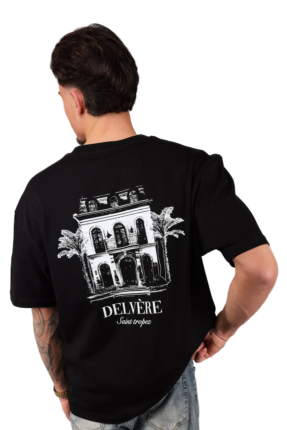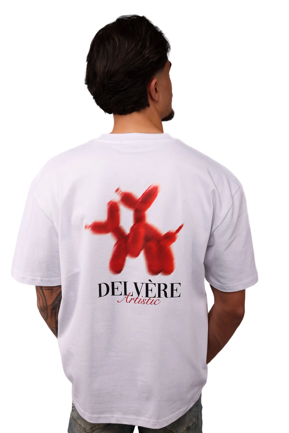 Op de achterkant staat een bloemenillustratie in diepe blauwtinten als krachtige print, met daaronder het DELVÈRE Artistic logo. De voorkant is minimalistisch en dat maakt het shirt: rustig van voren, statement van achter.